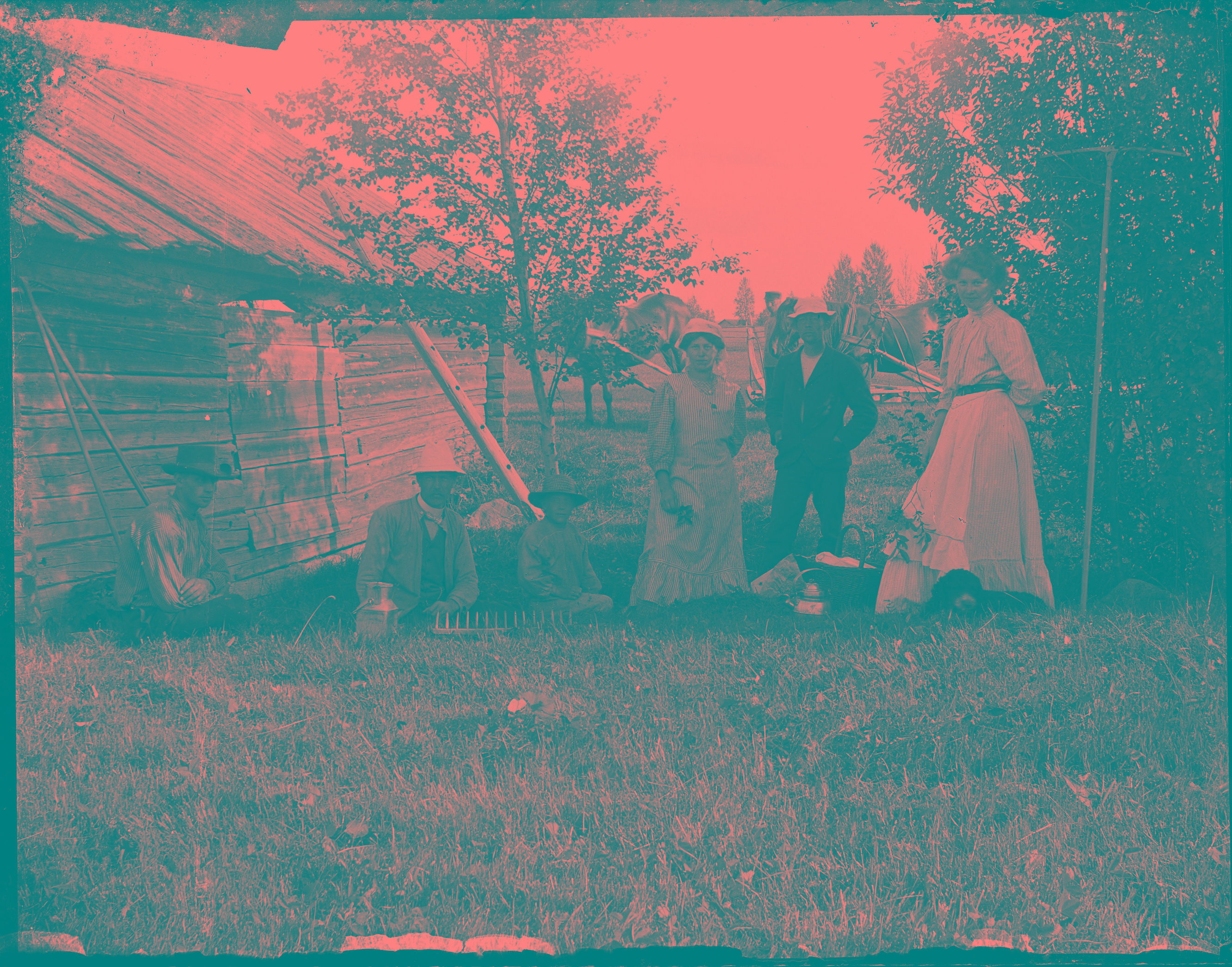Bild 11. Här är alldeles tydligt hässjan på gårdstunet en ren bakgrund. Gruppen av okända är finklädda och försedda med lite redskap, och den enda jag kan se som tillhör gårdsfolket är Nils Petter som står till höger med spettet.